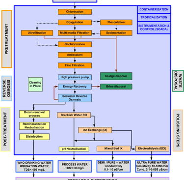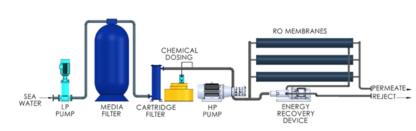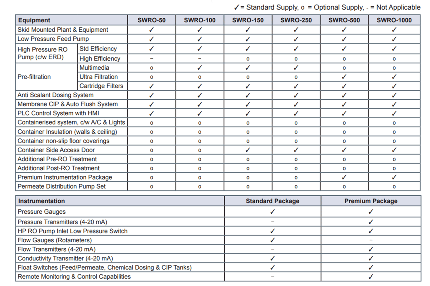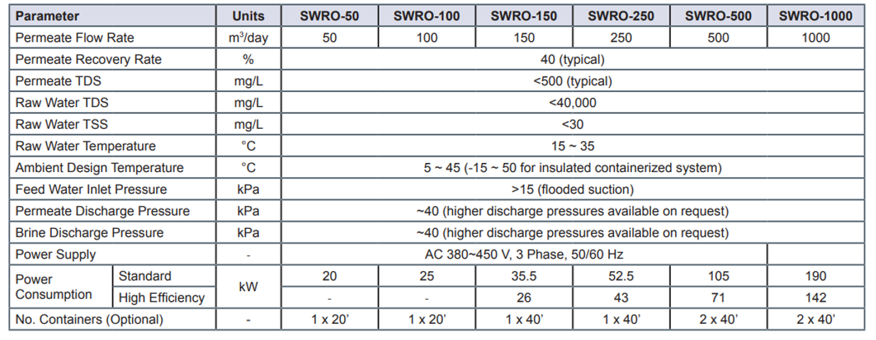 Memtik Water’s Sea Water Reverse Osmosis (SWRO) plants are designed to treat sea water, or high salinity ground water, with < 40,000 mg/L of dissolved solids (TDS) and < 30 mg/L of suspended solids (TSS), to achieve potable water quality. The standard treatment process involves pre filtration (auto backwashing multimedia filters and cartridge filters), anti-scalant dosing to prevent membrane scaling, RO desalination and auto flushing and CIP systems for membrane cleaning. Additional pre-RO and post-RO treatment steps may be added as required to suit feed water conditions and/or treated water quality requirements. The Memtik Water's SWRO plants are available as skid mounted or containerised systems.